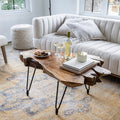 Meet The Evelyn Coffee Table - Featuring a solid Indonesian teak top and mid-century-inspired metal hairpin legs, these live-edge tables are each unique in shape and size. No two will ever look alike. This signature product line brings the beauty of responsibly sourced, live-edge wood furniture to your customers at a great price point.