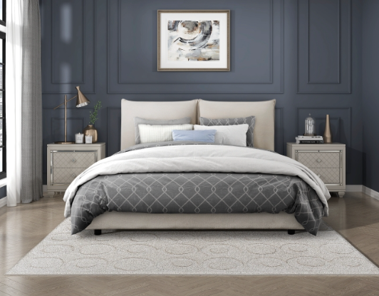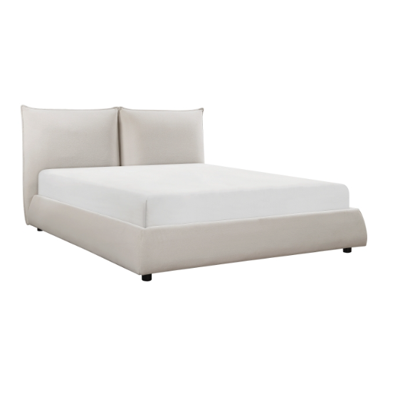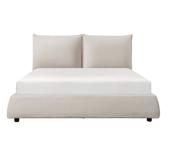 Meet the James Bed - The streamlined design of the James Bed creates an elegant profile pairing exquisitely with the modern vision of your bedroom. Beige chenille upholstered fabric covers the entirety of the queen bed’s frame lending a soft touch and neutral accent to your space. Knife-edge tailoring lends to the bed’s unfettered profile while the padded headboard creates a plush accent to the modern look.