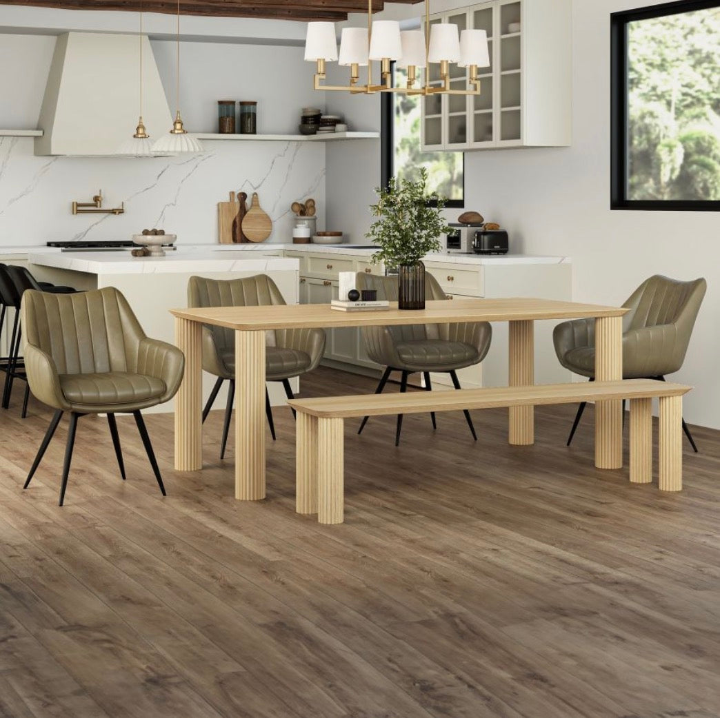 Meet the Jeremiah Dining Set - Blending the rustic charm of natural mango wood with the rich texture of moss leather for a stylish, modern look. The table, crafted from solid mango wood, showcases beautiful grain patterns and a warm, organic finish. It’s complemented by four moss leather chairs that add a touch of luxury and comfort with their soft, earthy hue. A matching mango wood bench provides additional seating, enhancing the set's inviting and versatile design. Whether hosting a dinner party or enjoying a casual meal, this set brings warmth and sophistication to any dining space.