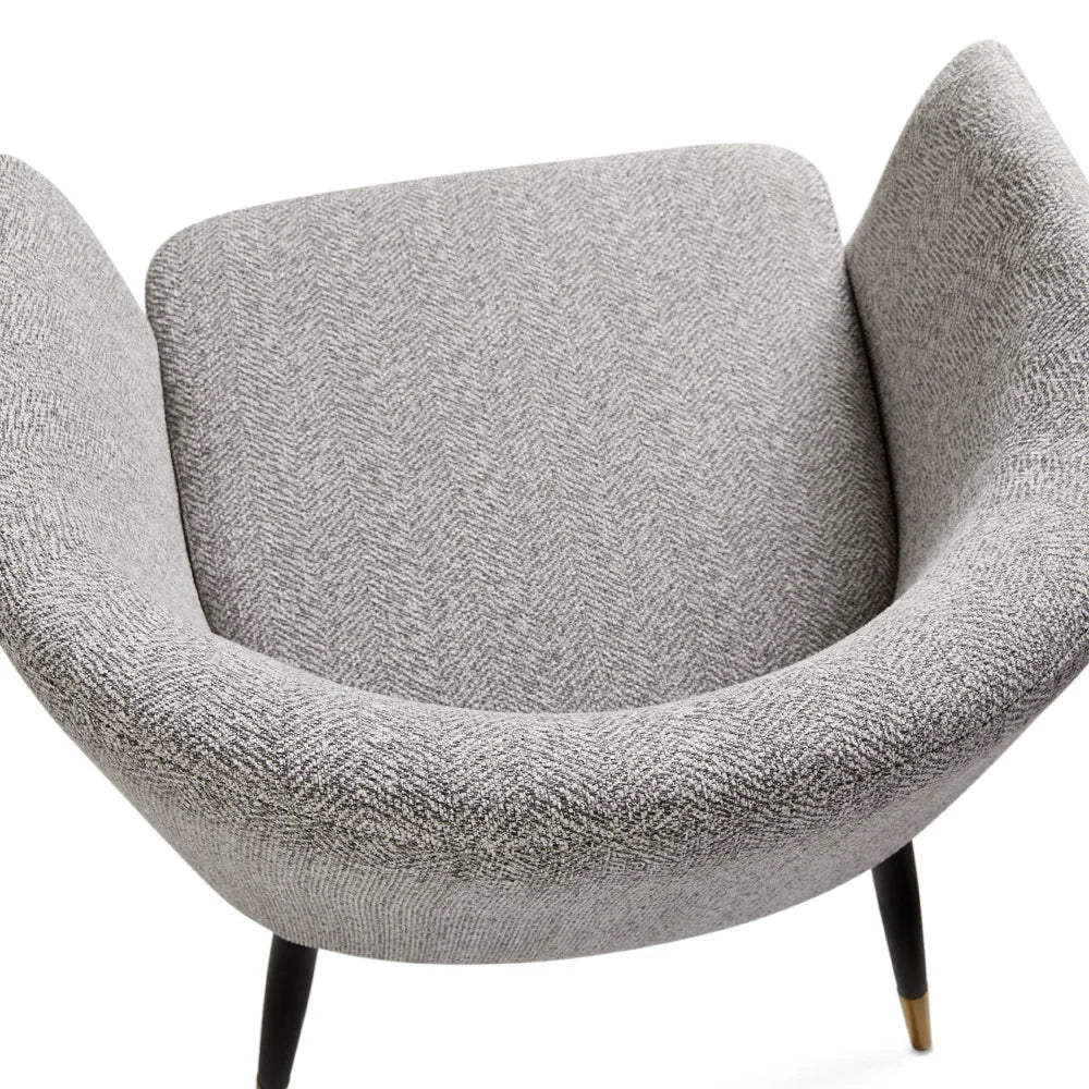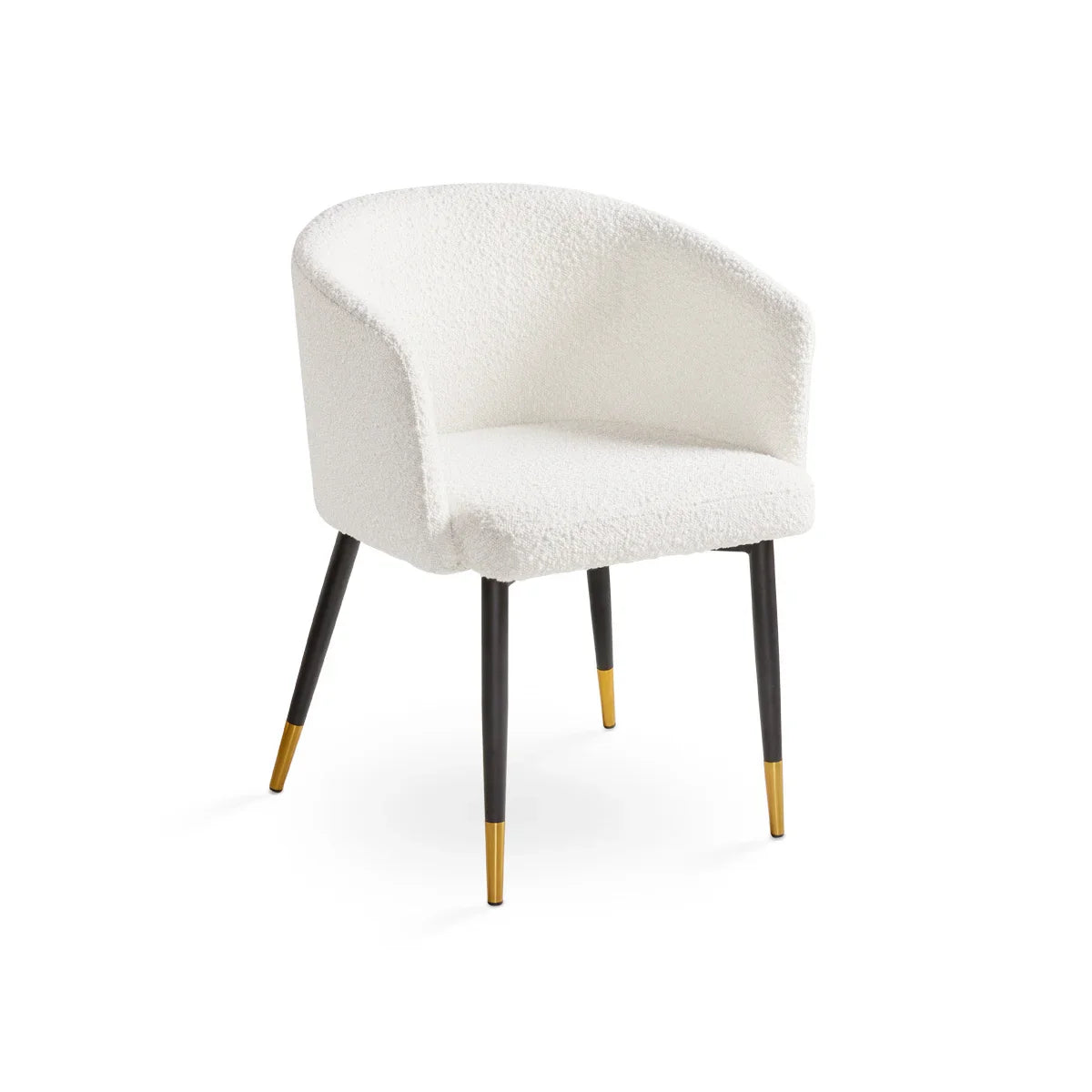 Meet the Josie Chair – a modern masterpiece that seamlessly combines comfort and elegance. Cloaked in luxurious white bouclé, this chair boasts a chic silhouette perched on sleek black legs with opulent gold caps. Its clean lines and sophisticated color palette make it a versatile addition to any space, creating a perfect blend of contemporary style and timeless allure. Elevate your interior with the Josie Chair – where comfort meets glamour in a compact, stylish package.