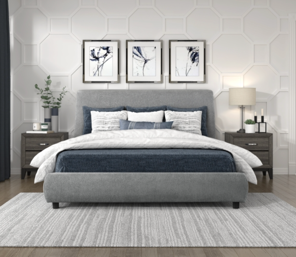 Meet The Patrick Bed - The design is comprised of unfettered lines and soft touch, creating an elegant addition for any modern bedroom. The unfettered profile of the queen headboard’s profile solidifies the collection’s modern aesthetic. Chenille fabric upholstery covers the ultra-low platform bed’s headboard, footboard, and rails.