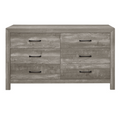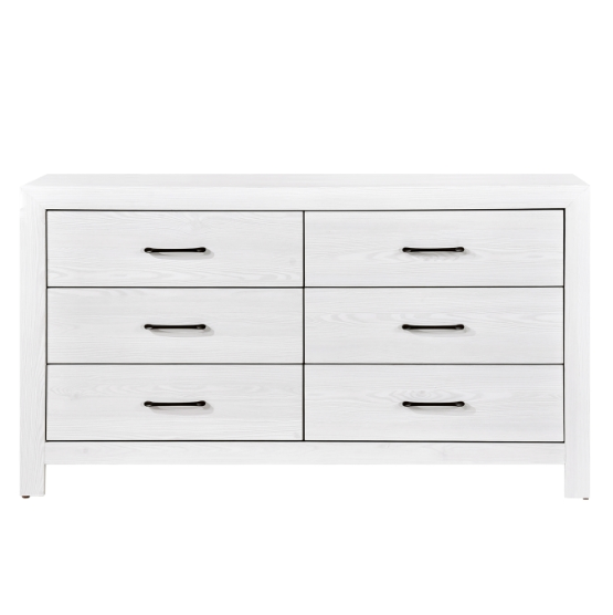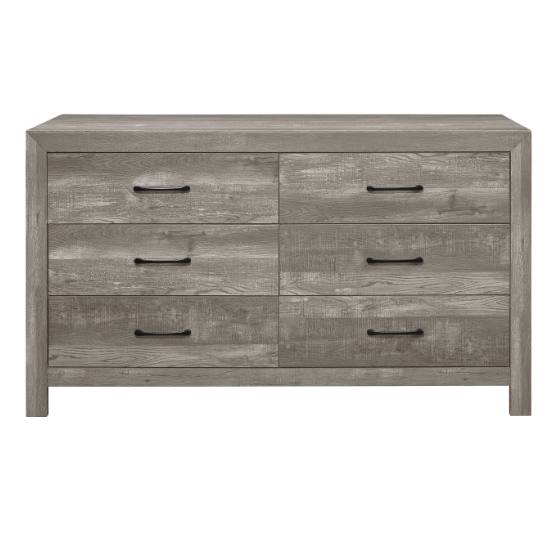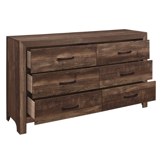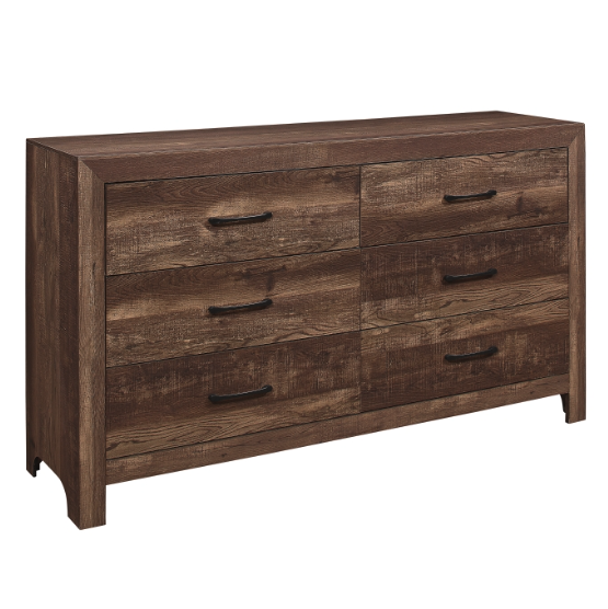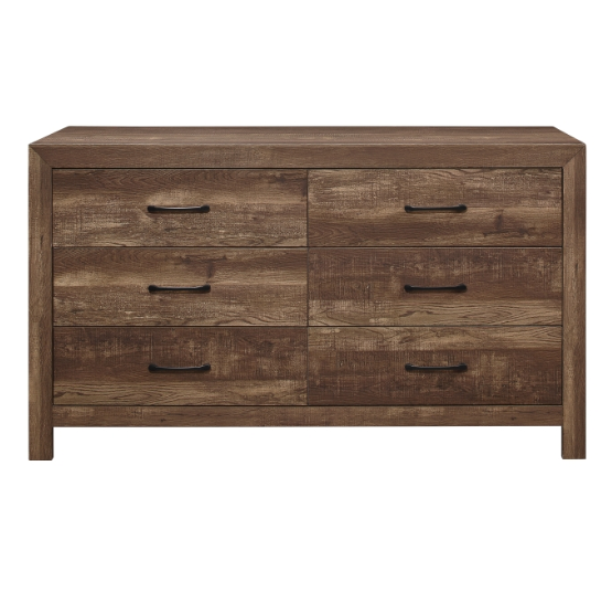 Meet The Sharon Dresser - Modern lines and rustic styling are paired to create this look. The embossed faux-wood veneer’s texture is highlighted by a rustic brown finish for a realistic wood look. Providing complementing contrast, the drawer fronts of the dresser feature black metal hardware. Subtle framing defines the profile of the dresser, further lending to the unfettered design of the collection.