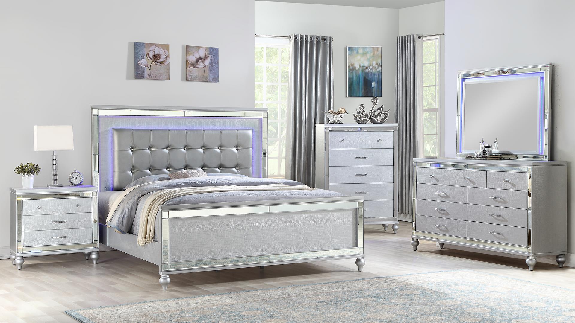 Elevate your bedroom with the Stanley Bedroom Set, a luxurious ensemble designed to blend modern sophistication with timeless style. This complete set features a striking king bed with a silver finish and an LED-accented PU headboard, accompanied by a matching dresser, mirror, nightstand, and chest. Each piece is thoughtfully crafted to complement the others, creating a cohesive and elegant ambiance. The Stanley Bedroom Set is the ideal choice for anyone looking to transform their bedroom into a sanctuary of contemporary luxury and refined design.