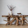 Meet The Teak Grove Console - A one of a kind masterpiece. Built from the root systems of previously felled Teak trees, these uniquely designed live edge consoles make the perfect entry and sofa tables or anywhere a statement must be made. This signature product line brings the beauty of responsibly sourced, live-edge wood furniture to your customers at a great price point. Each piece is unique and will vary in size and shape.